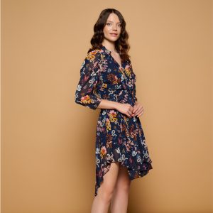 Φόρεμα με ασύμμετρο βολάν στο τελείωμα. Μακριά μανίκια. V ντεκολτέ με κορδόνι. Boho τύπωμα. Ριχτό ύφασμα. Το μοντέλο έχει ύψος 177 cm και φοράει μέγεθος S.